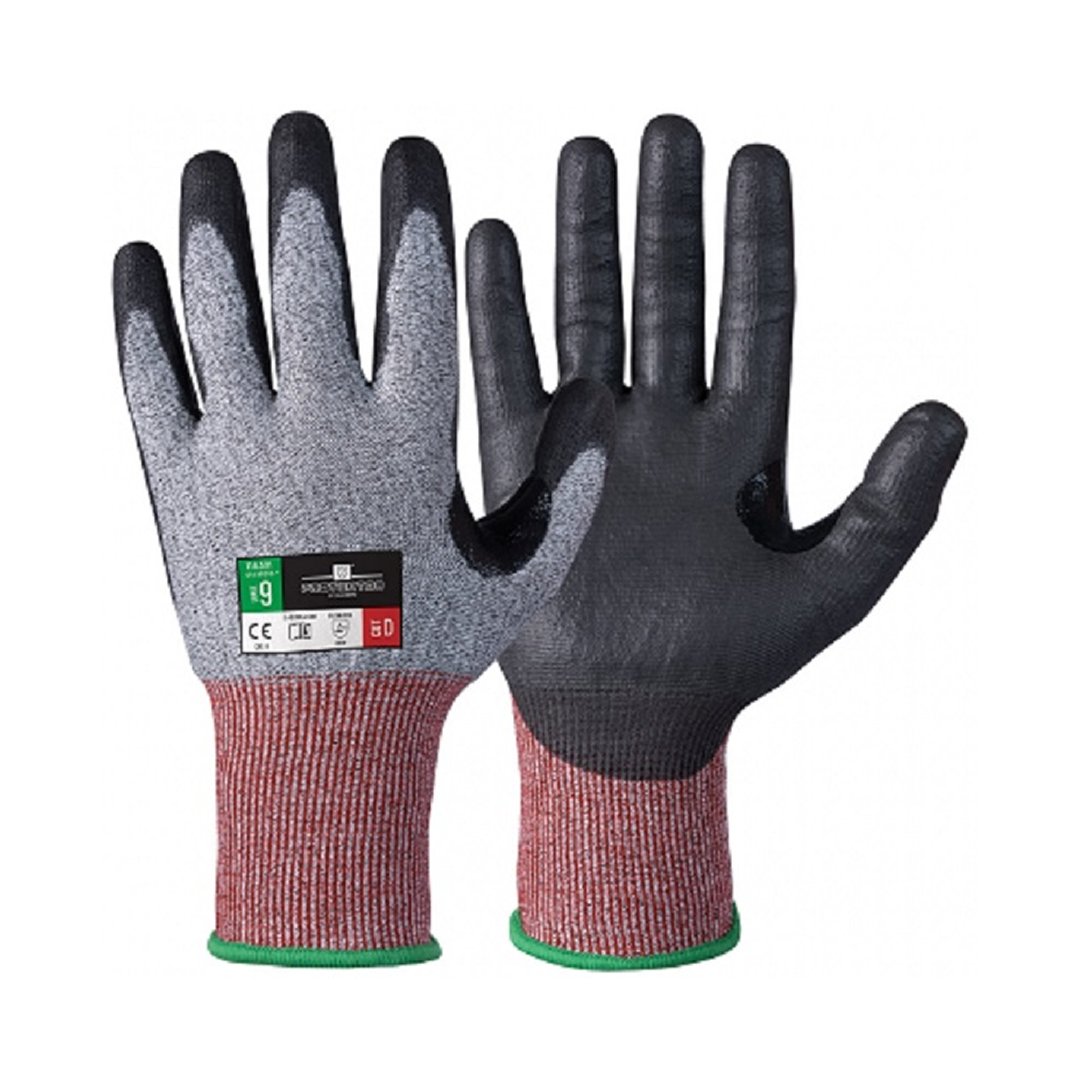 Rękawice wykonano z wysokowytrzymałego włókna TYPHOON — materiału zaprojektowanego specjalnie pod kątem odporności na przecięcie przy zachowaniu elastyczności dzianiny. Bardzo drobny ścieg 18G (jeden z najdrobniejszych na rynku rękawic przeciwprzecięciowych) daje cienką, precyzyjnie dopasowaną podszewkę i przekłada się bezpośrednio na zręczność palców podczas pracy z małymi elementami.